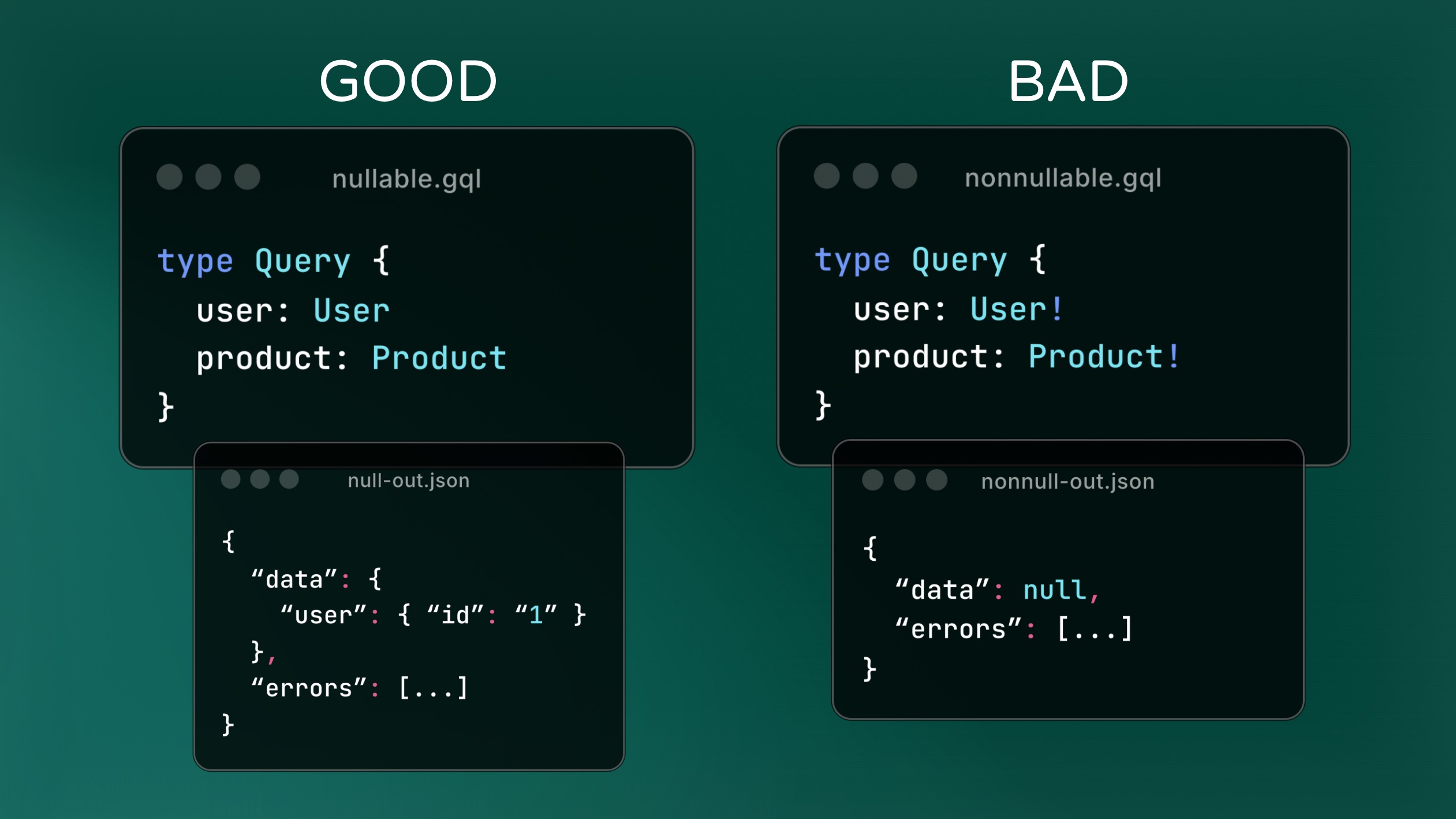 Returning partial data can dramatically improve a user’s experience for example if your system has a partial outage. Keeping root query fields nullable ensures any one field can’t break the entire client operation.