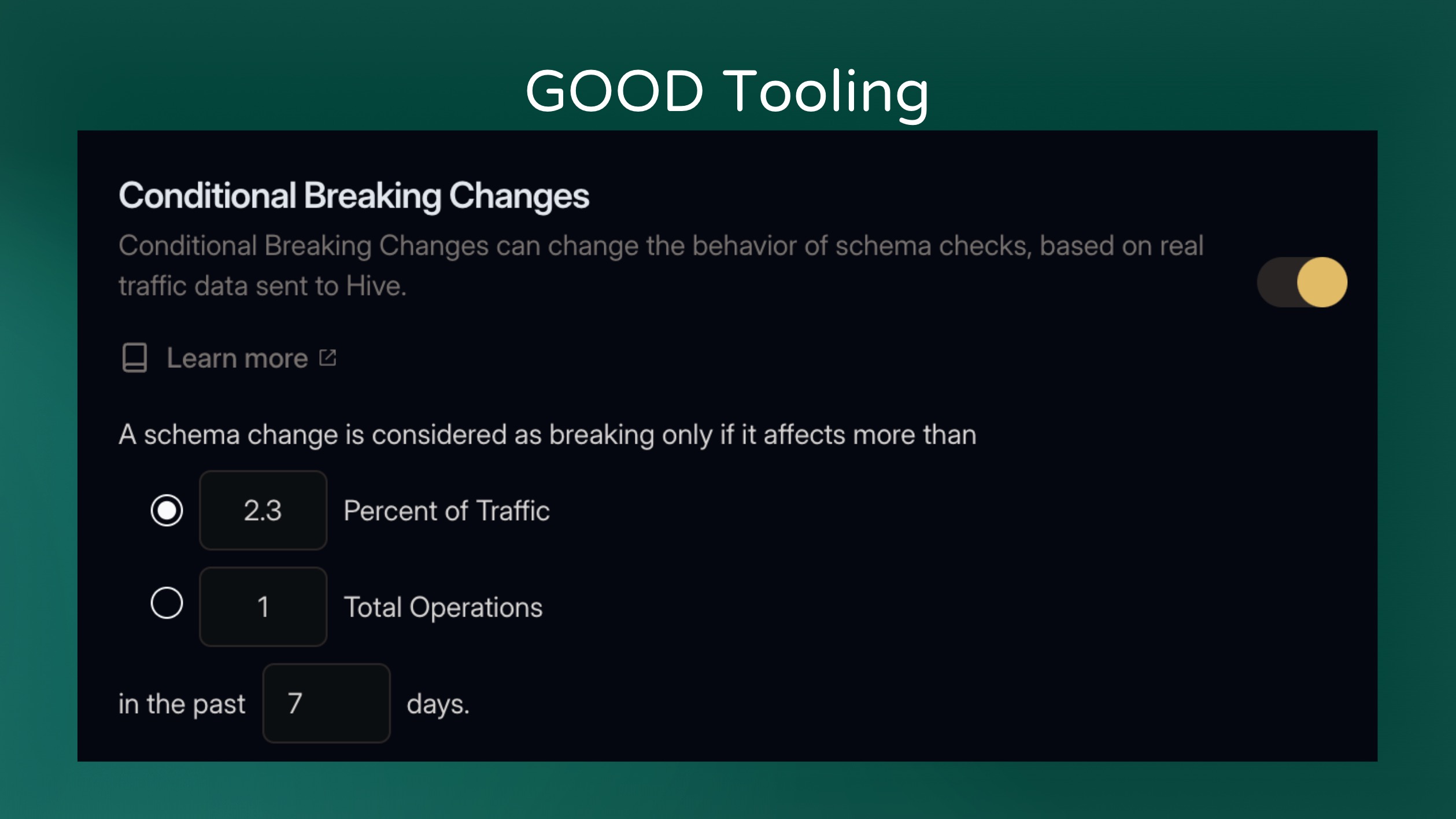 Tooling such as Hive Console can also help. We offer a feature called “Conditional Breaking Changes” that checks usage data on breaking changes. And if the portion of the schema that broke isn’t used, then the change is allowed. Otherwise the change is still flagged as breaking.
